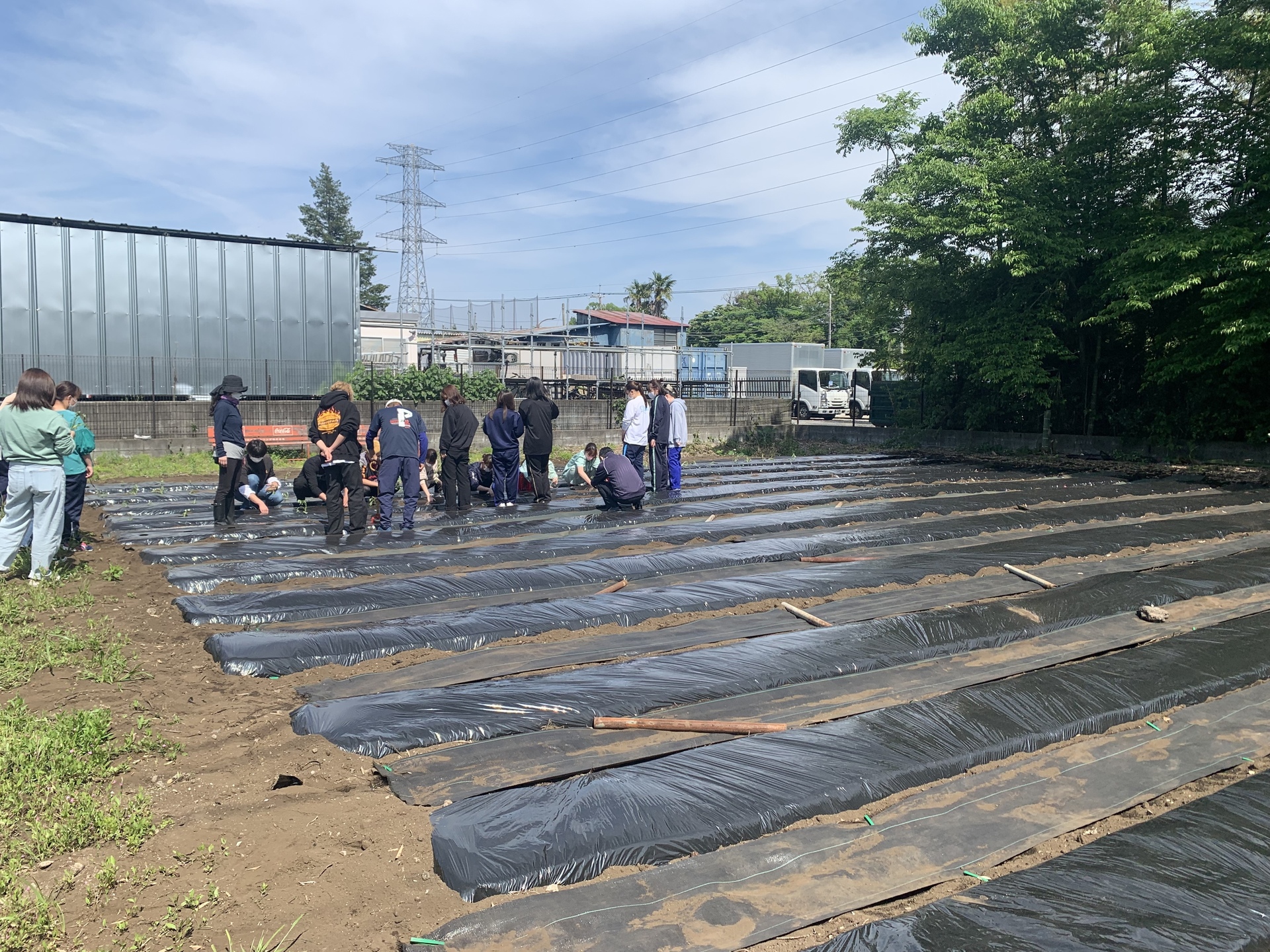 毎年恒例の、さつまいも植え付けのご協力をさせて頂きました。環境授業のお手伝いです。