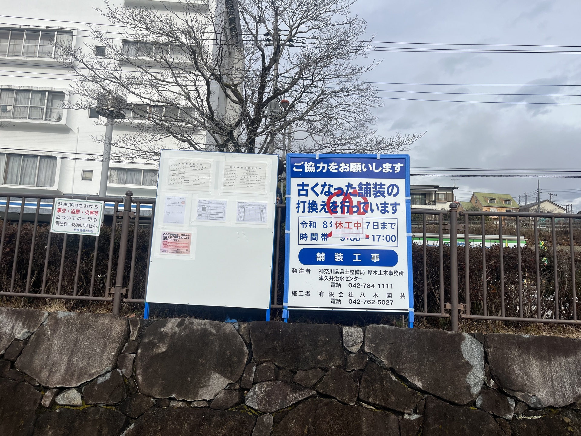 山の検査も無事終わり、新しい現場が始まります。相模湖公園駐車場入り口の舗装打ち換えです。